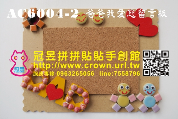 材料包內容:留言板,雙愛心,DAD木質素材〈原木色 彩繪木質素材〉、DIY馬賽克磁磚、玻璃扁珠、貝殼DIY、動動眼、彩色圖片、白膠〈共用〉