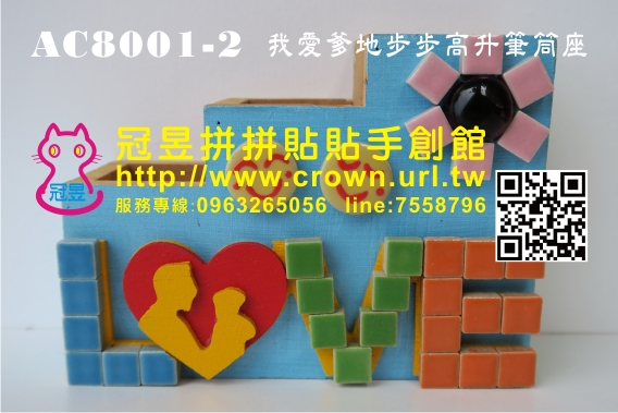 材料包內容:步步高升筆筒座,父與子,LOVE木質素材〈原木色 彩繪木質素材〉、DIY馬賽克瓷磚、扁珠、彩色圖片、白膠〈共用〉